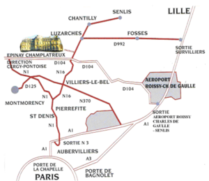 Sortir Aéroport Charles de Gaulle (sortie N°6) – Suivre Zone technique (panneaux blancs) – puis direction Cergy Pontoise (panneaux verts) – prendre la D104 (Francilienne) en direction de Cergy Pontoise (sur 11km) – 3è sortie : Chantilly / Luzarches / D316.